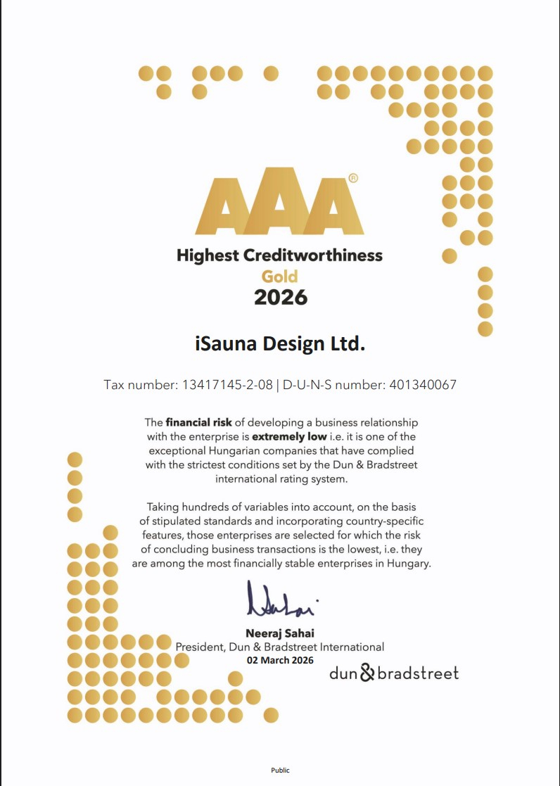 iSauna Design Kft. has received Dun & Bradstreet's AA (double A) Certificate, which indicates that the financial risk of establishing business relations with our company is very low.